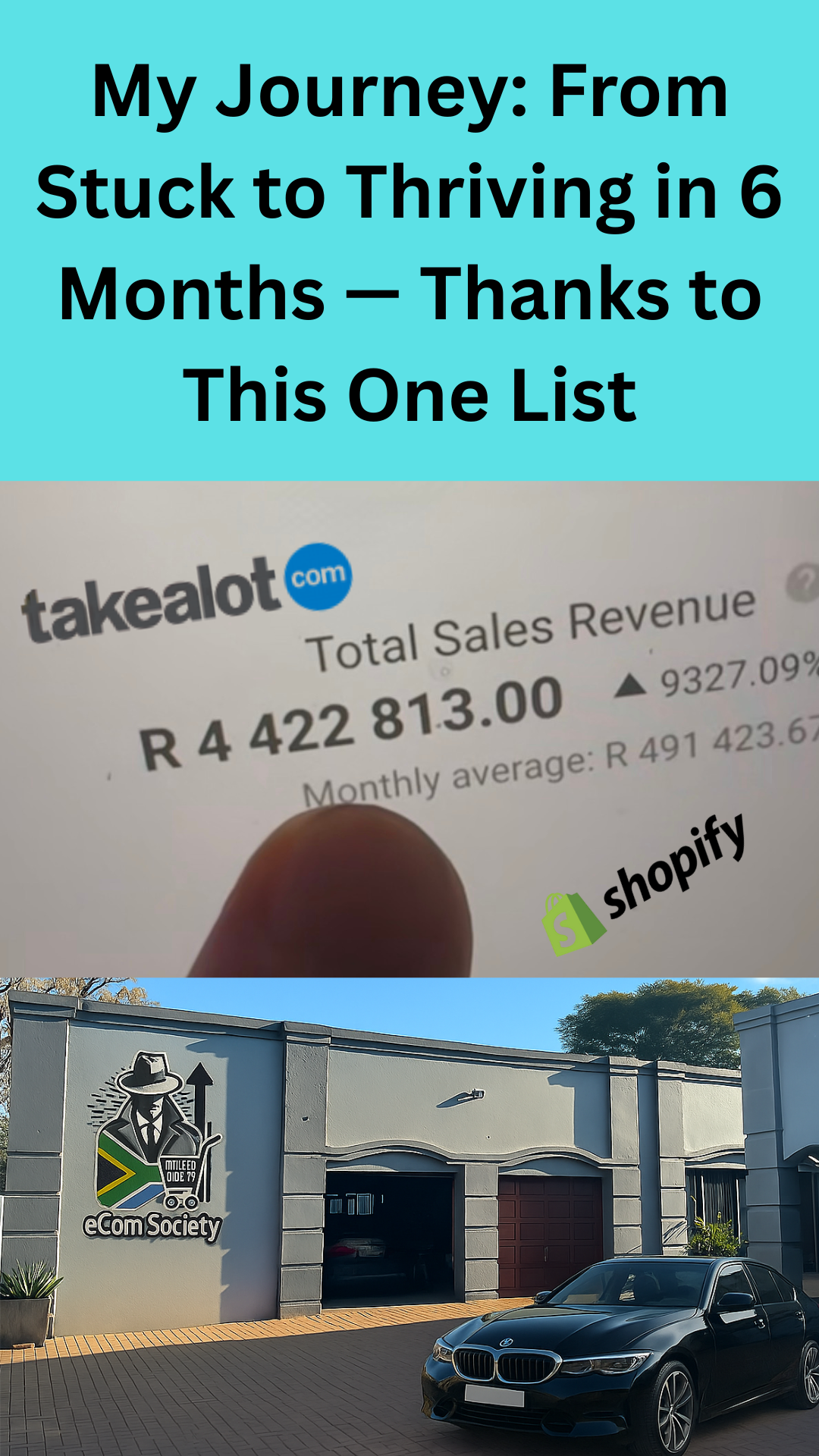 Big Shout out to Jay and the eCom Society Team I never thought it was possible to make money online in South Africa. I purchased the list and started listing the items and have maintained an Average of R50k extra a month this year!